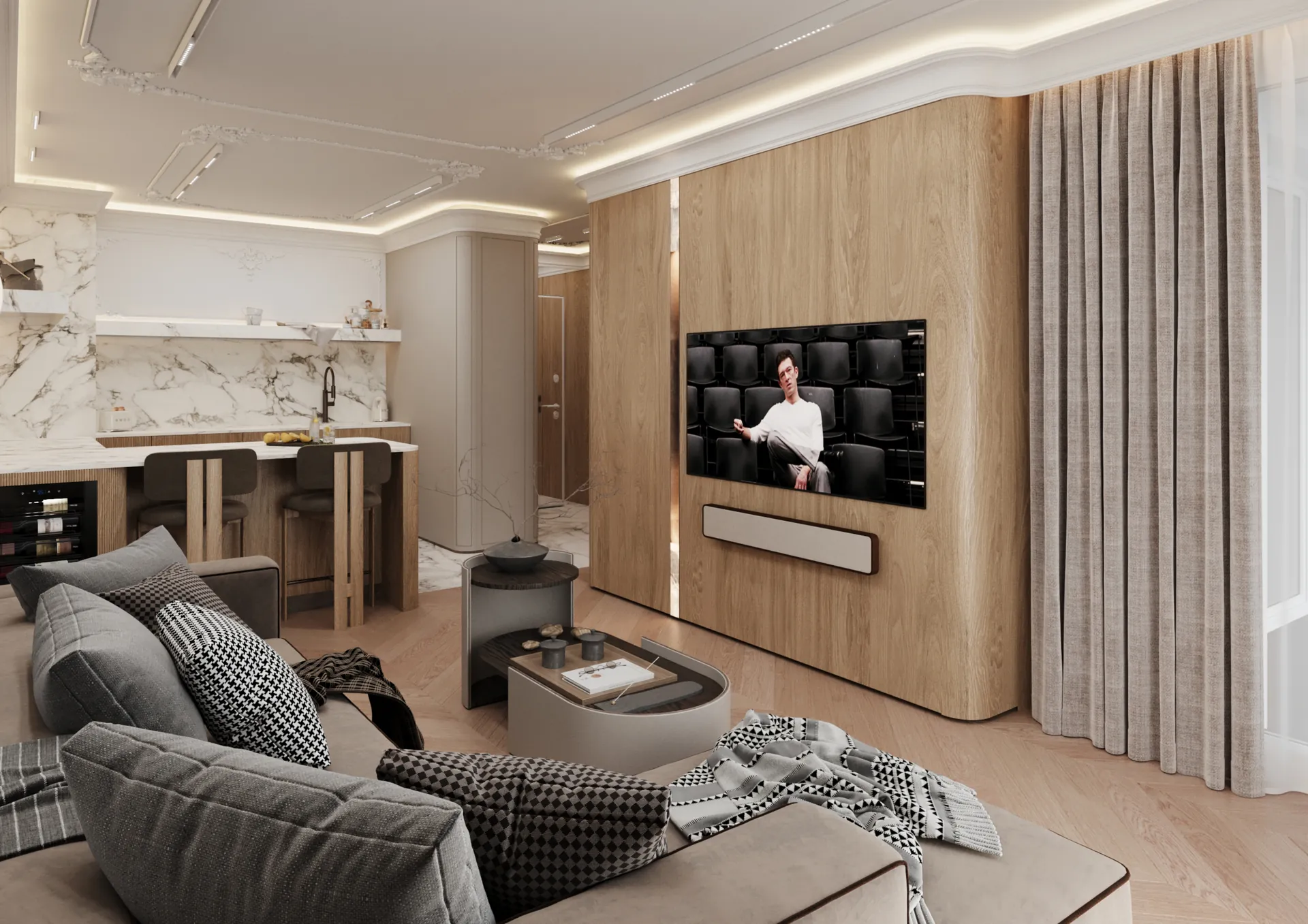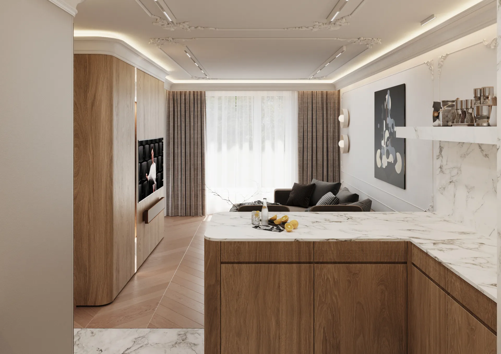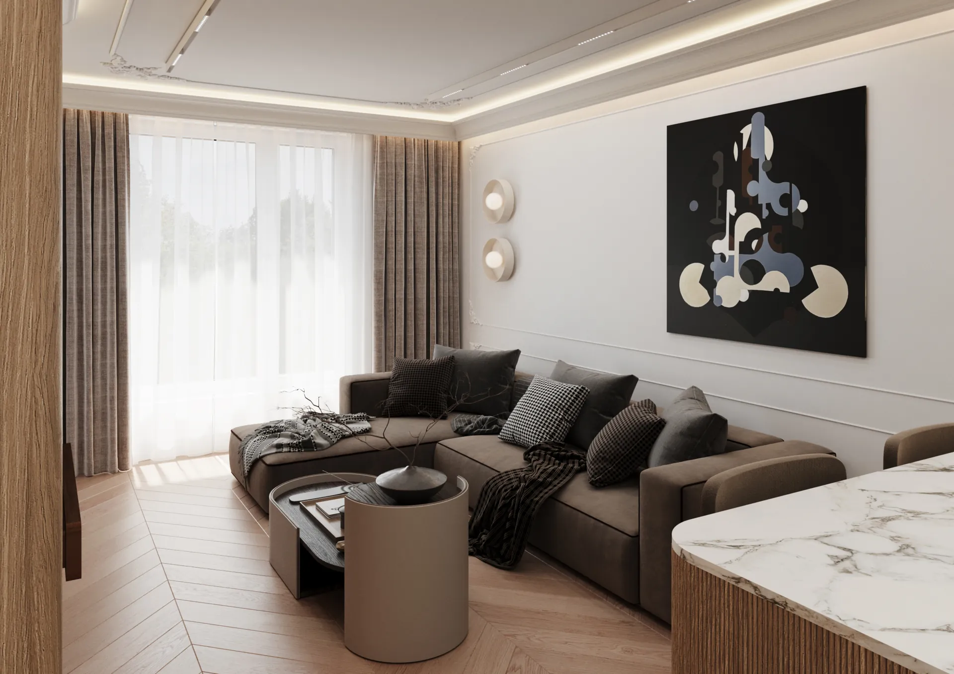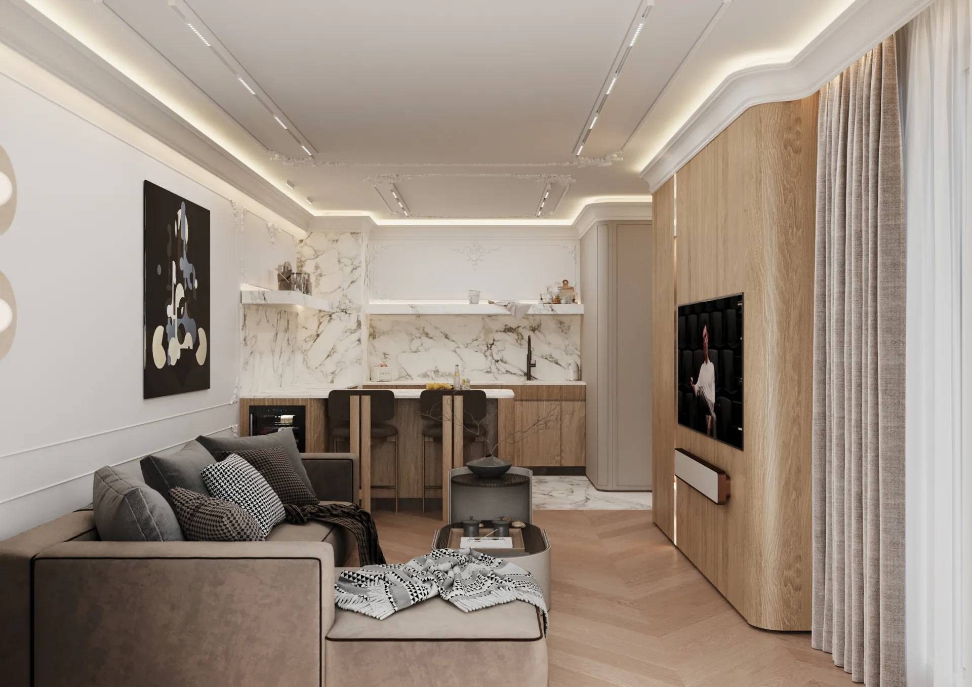 W sercu nadmorskiego Sopotu, ten apartament stanowi harmonijną syntezę współczesnego minimalizmu z subtelnymi akcentami klasycznej elegancji, gdzie przestrzeń staje się narracją o lekkości i wyrafinowaniu. Architektura wnętrz opiera się na otwartej kompozycji, w której strefy funkcjonalne płynnie przechodzą jedna w drugą, podkreślane przez strategiczne użycie naturalnego światła i precyzyjnie zintegrowane oświetlenie. Dominująca paleta barw – biel, beże i ciepłe odcienie drewna – kontrastuje z dynamicznymi wzorami marmuru, tworząc wizualny rytm, który optycznie powiększa i ożywia powierzchnię.