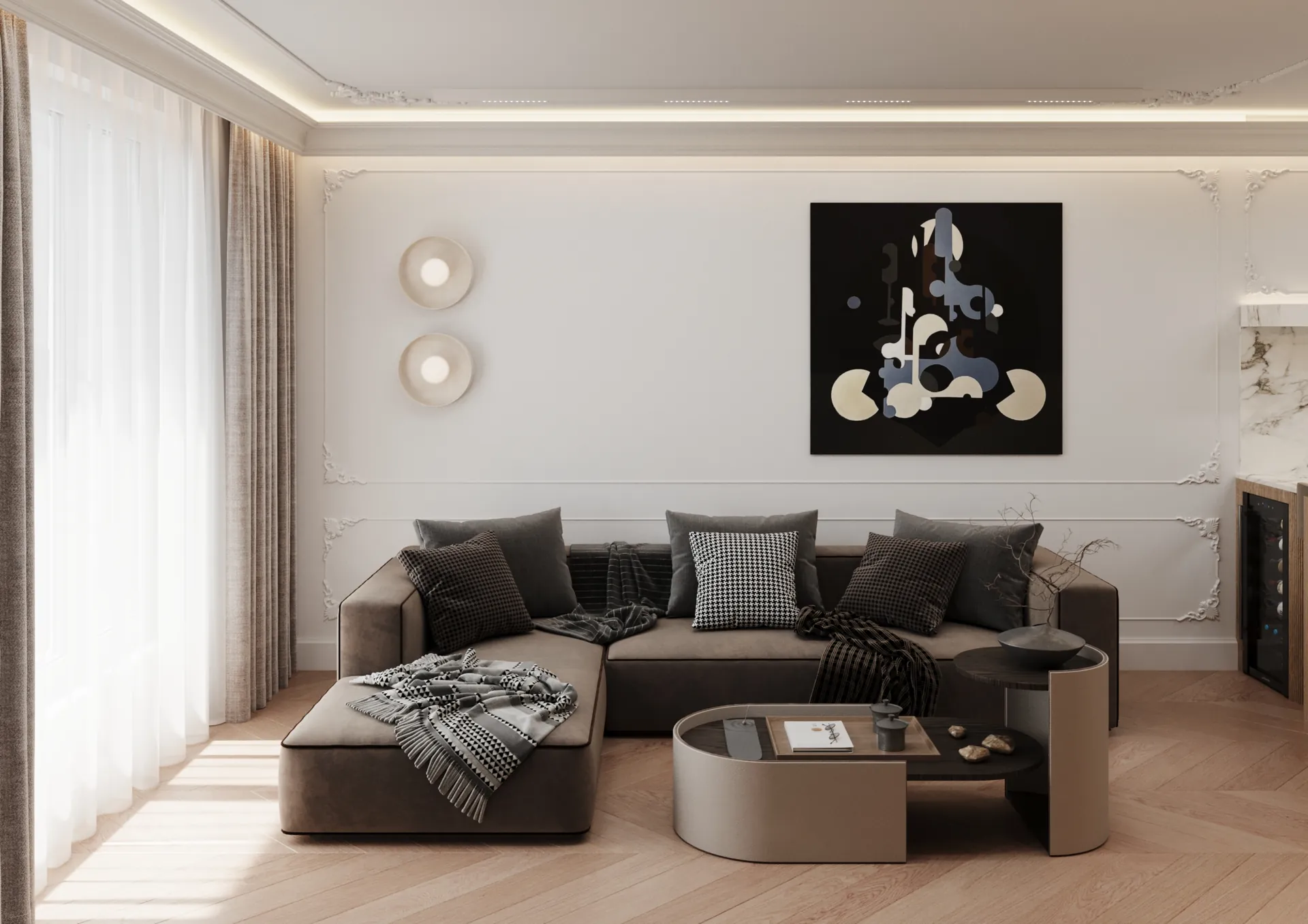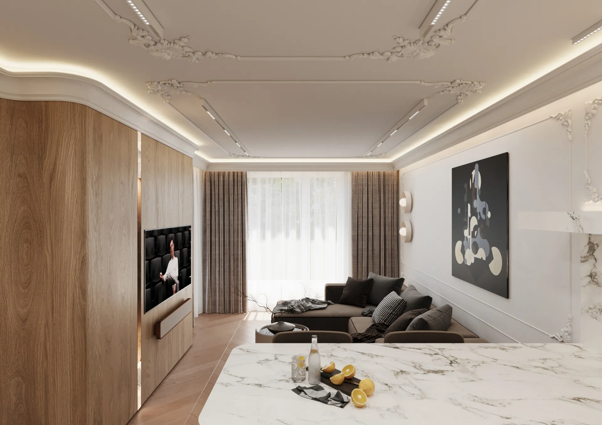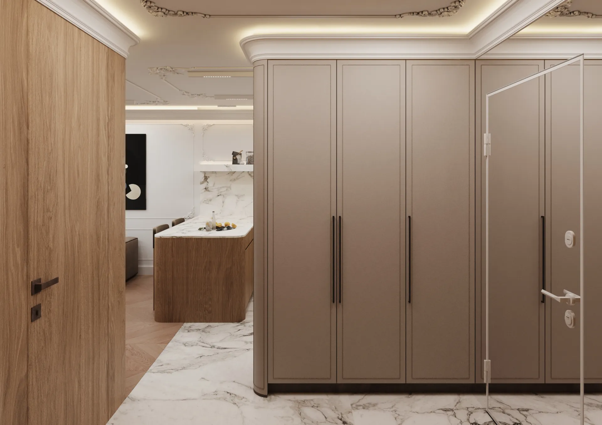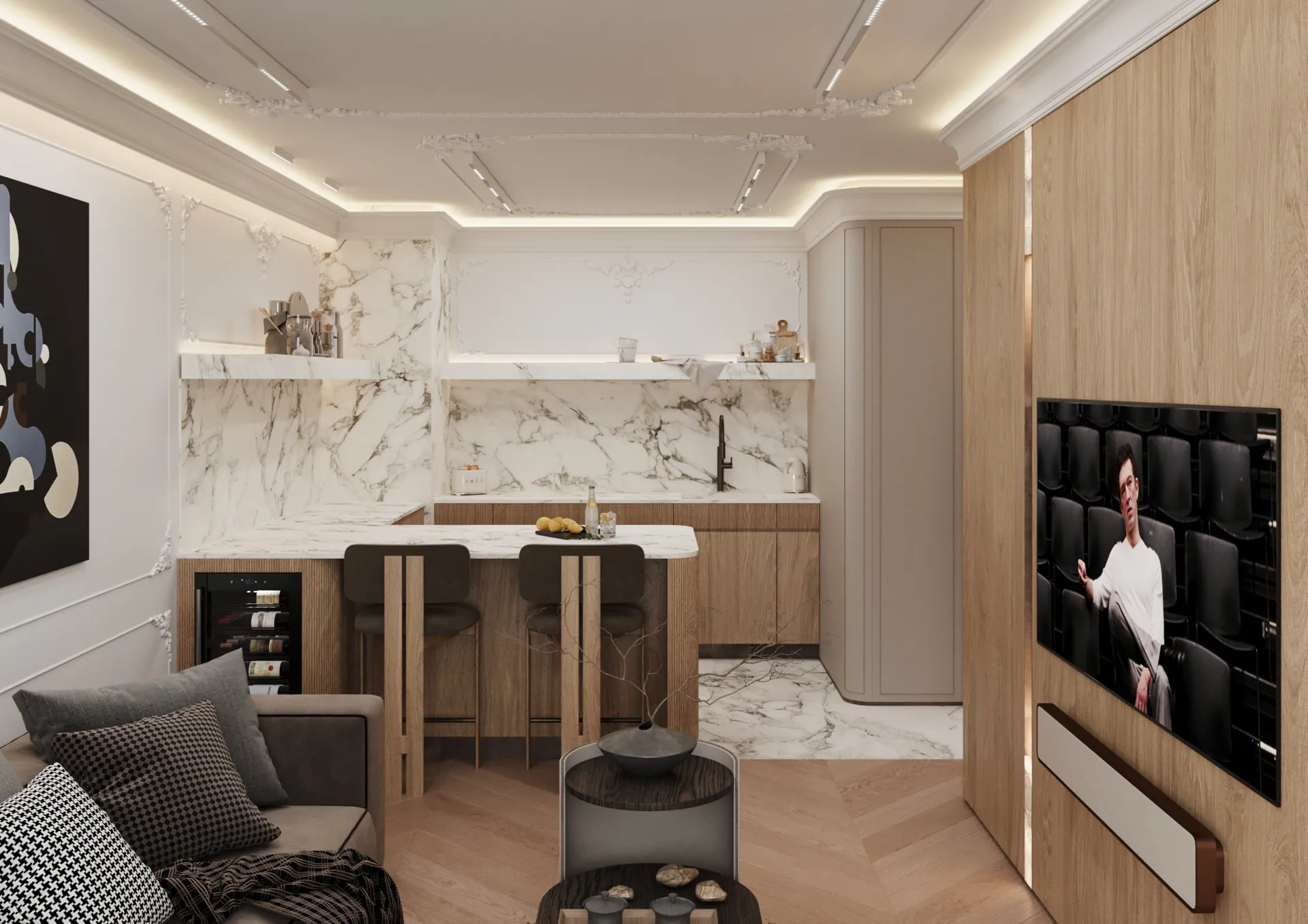 W sercu nadmorskiego Sopotu, ten apartament stanowi harmonijną syntezę współczesnego minimalizmu z subtelnymi akcentami klasycznej elegancji, gdzie przestrzeń staje się narracją o lekkości i wyrafinowaniu. Architektura wnętrz opiera się na otwartej kompozycji, w której strefy funkcjonalne płynnie przechodzą jedna w drugą, podkreślane przez strategiczne użycie naturalnego światła i precyzyjnie zintegrowane oświetlenie. Dominująca paleta barw – biel, beże i ciepłe odcienie drewna – kontrastuje z dynamicznymi wzorami marmuru, tworząc wizualny rytm, który optycznie powiększa i ożywia powierzchnię.
