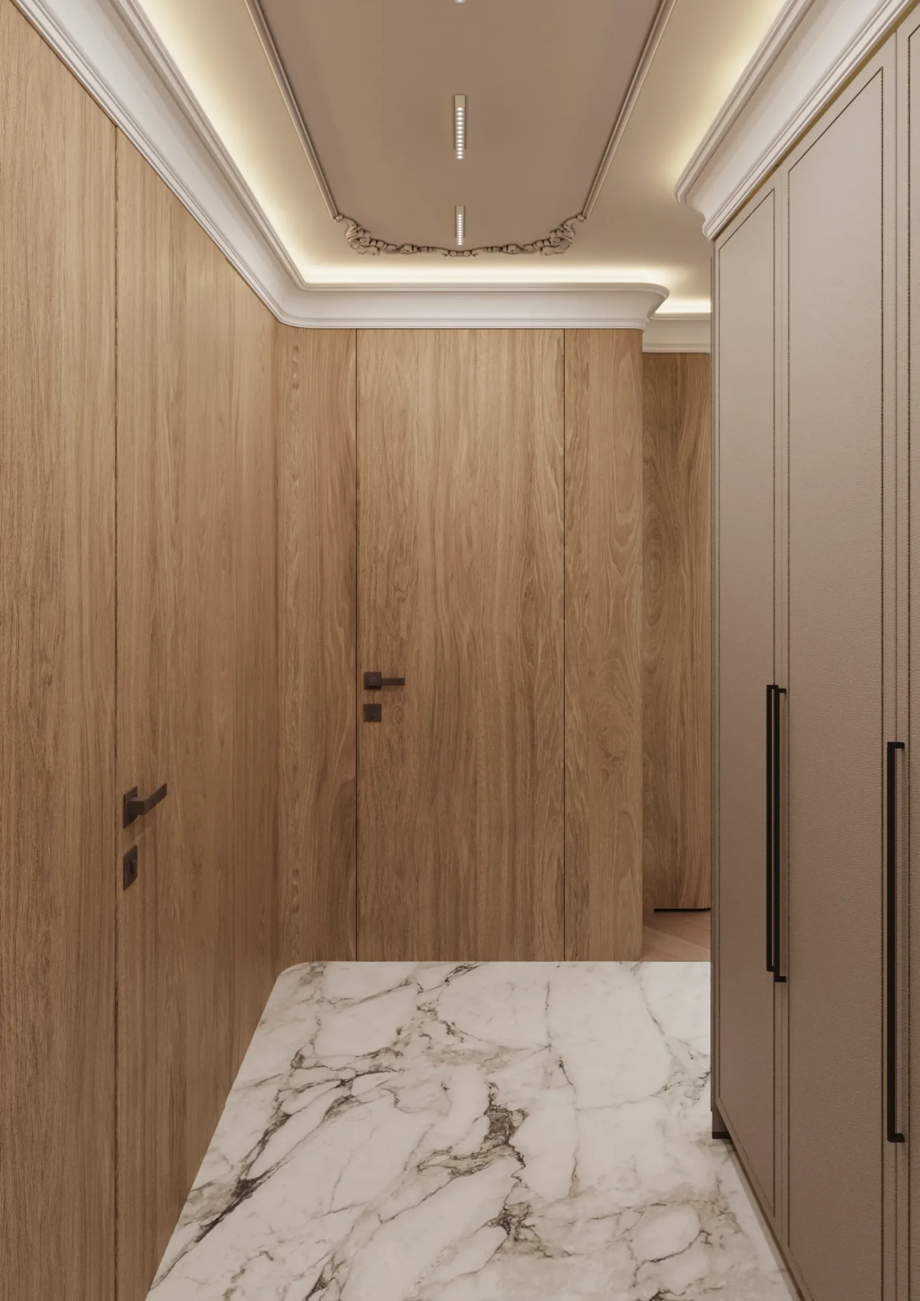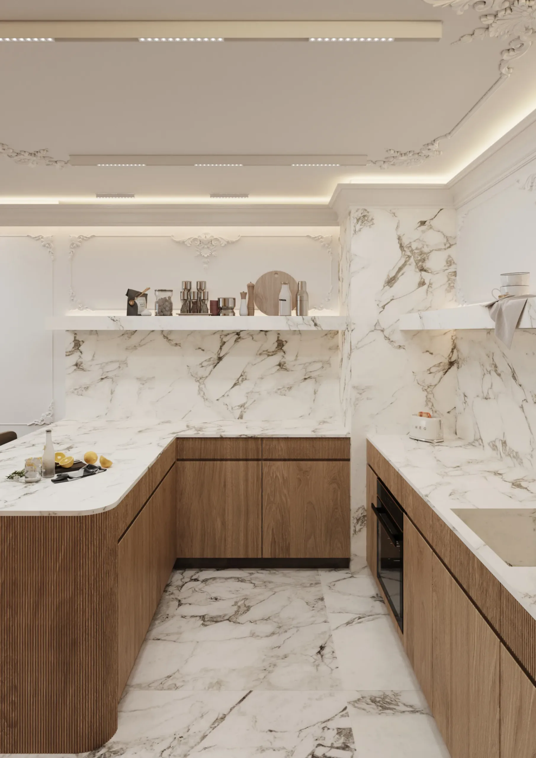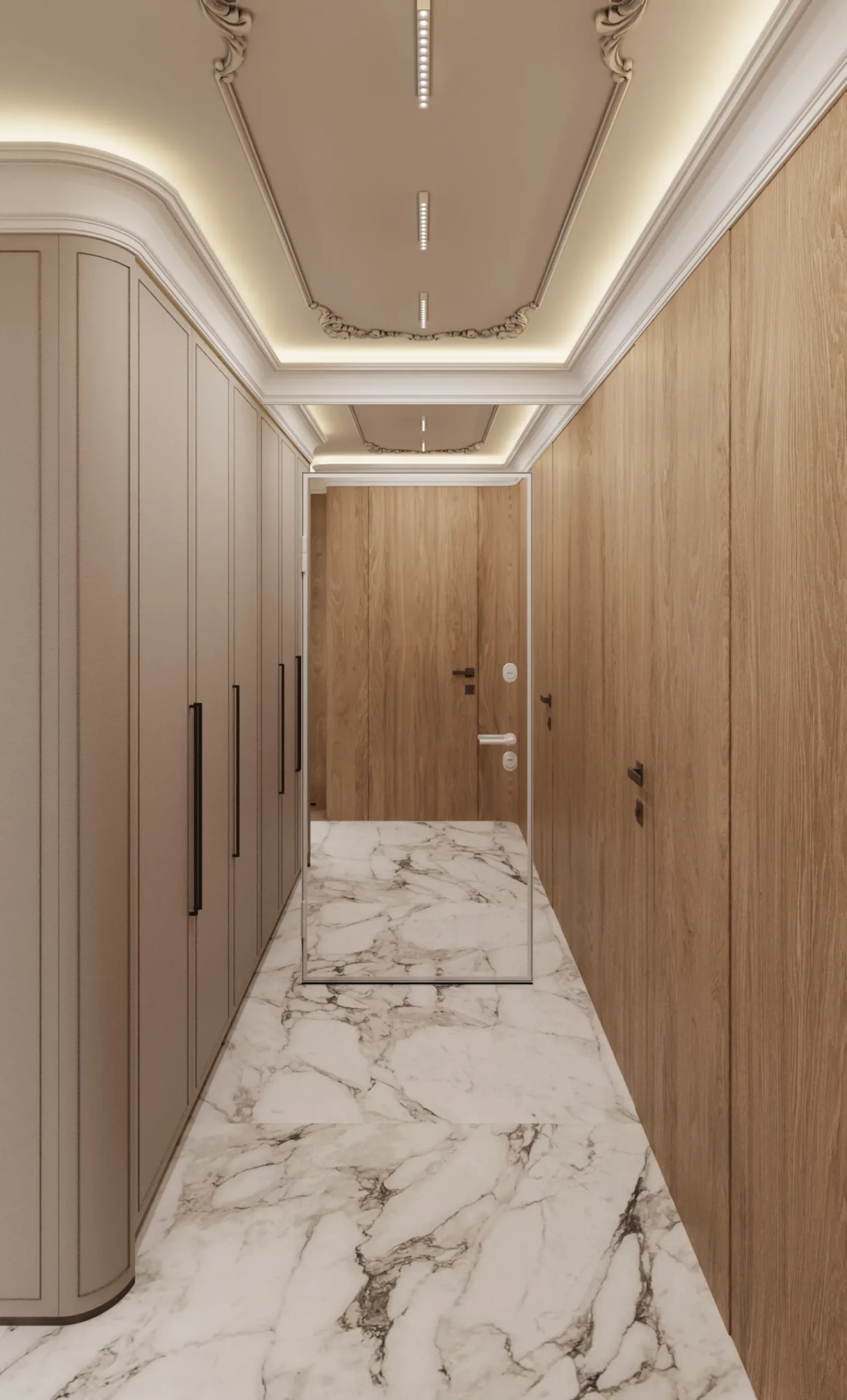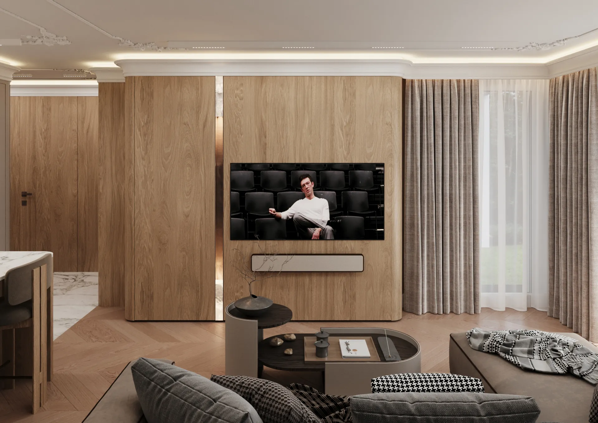 W sercu nadmorskiego Sopotu, ten apartament stanowi harmonijną syntezę współczesnego minimalizmu z subtelnymi akcentami klasycznej elegancji, gdzie przestrzeń staje się narracją o lekkości i wyrafinowaniu. Architektura wnętrz opiera się na otwartej kompozycji, w której strefy funkcjonalne płynnie przechodzą jedna w drugą, podkreślane przez strategiczne użycie naturalnego światła i precyzyjnie zintegrowane oświetlenie. Dominująca paleta barw – biel, beże i ciepłe odcienie drewna – kontrastuje z dynamicznymi wzorami marmuru, tworząc wizualny rytm, który optycznie powiększa i ożywia powierzchnię.