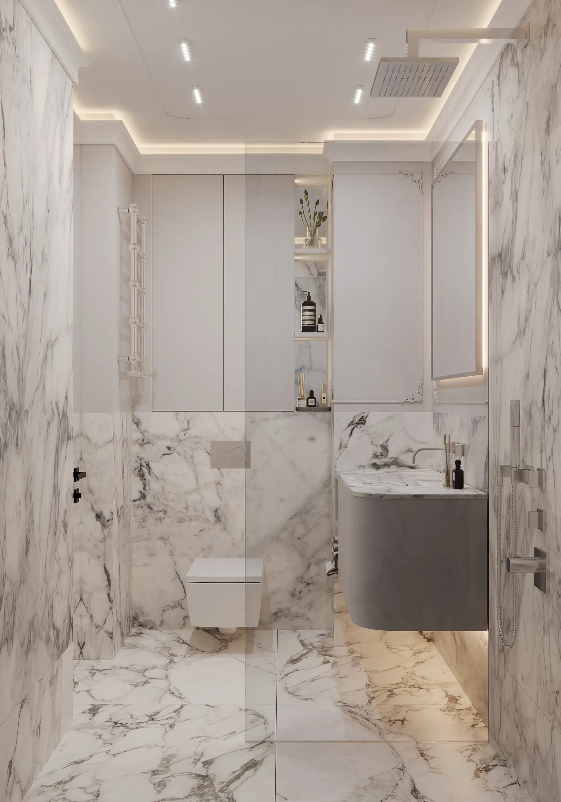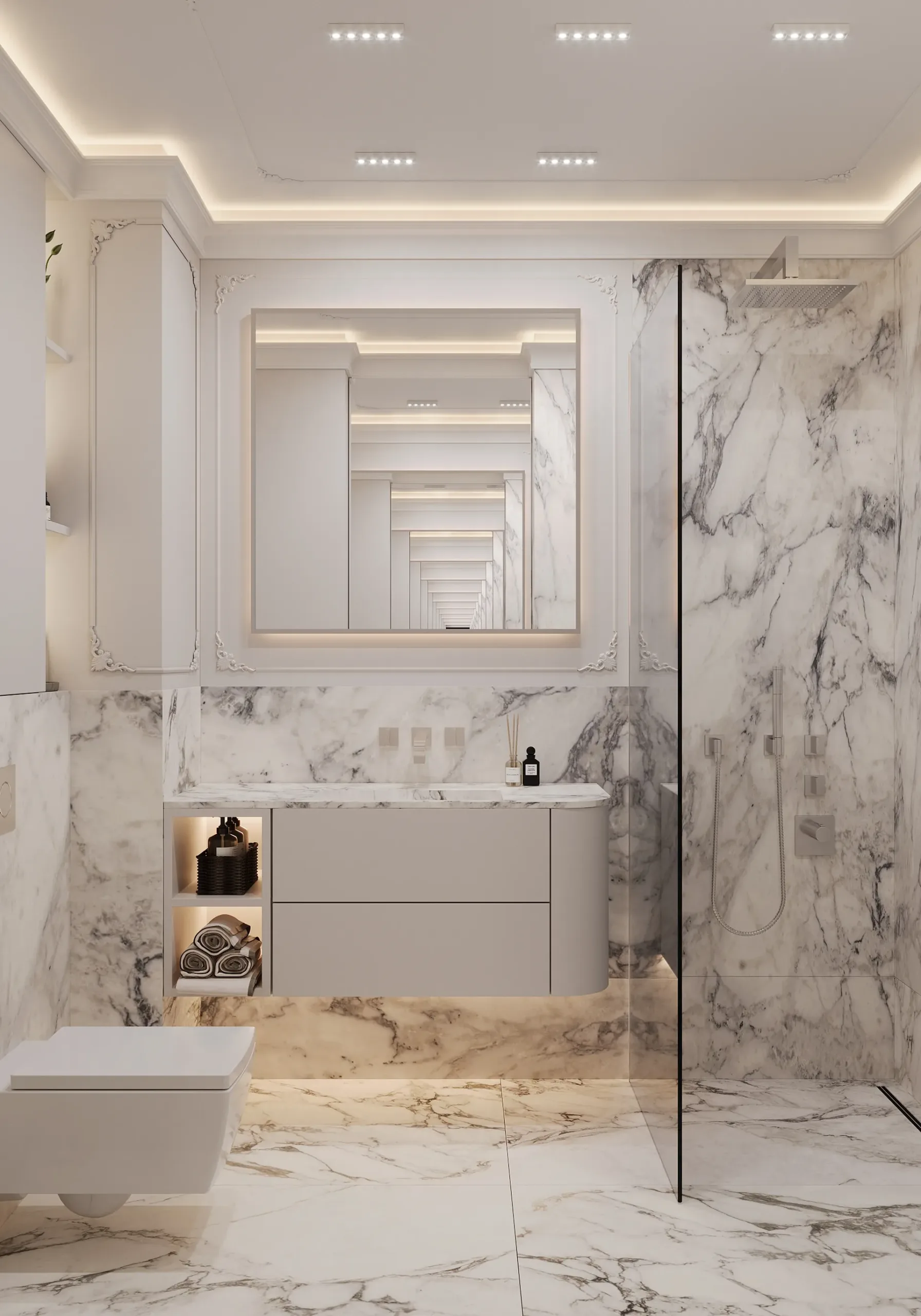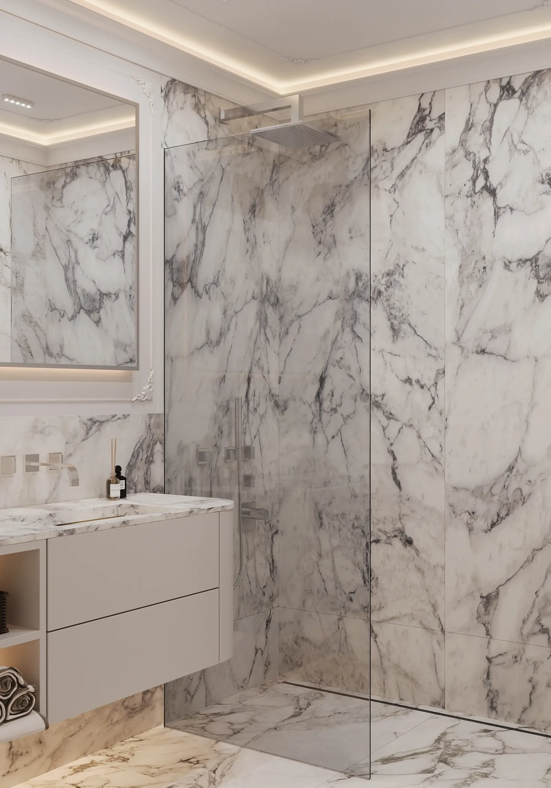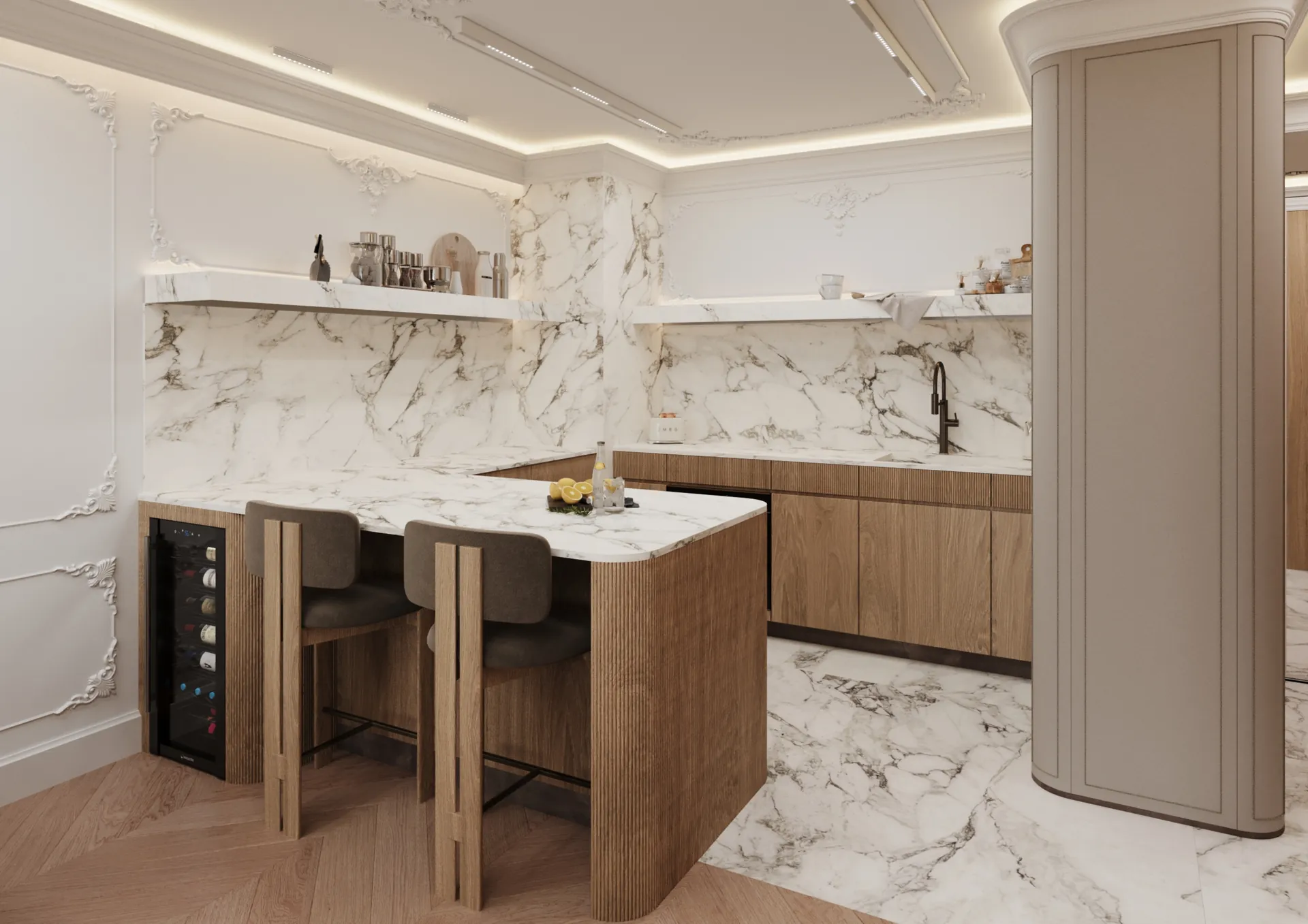W sercu nadmorskiego Sopotu, ten apartament stanowi harmonijną syntezę współczesnego minimalizmu z subtelnymi akcentami klasycznej elegancji, gdzie przestrzeń staje się narracją o lekkości i wyrafinowaniu. Architektura wnętrz opiera się na otwartej kompozycji, w której strefy funkcjonalne płynnie przechodzą jedna w drugą, podkreślane przez strategiczne użycie naturalnego światła i precyzyjnie zintegrowane oświetlenie. Dominująca paleta barw – biel, beże i ciepłe odcienie drewna – kontrastuje z dynamicznymi wzorami marmuru, tworząc wizualny rytm, który optycznie powiększa i ożywia powierzchnię.
